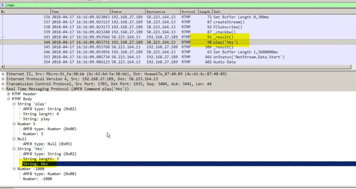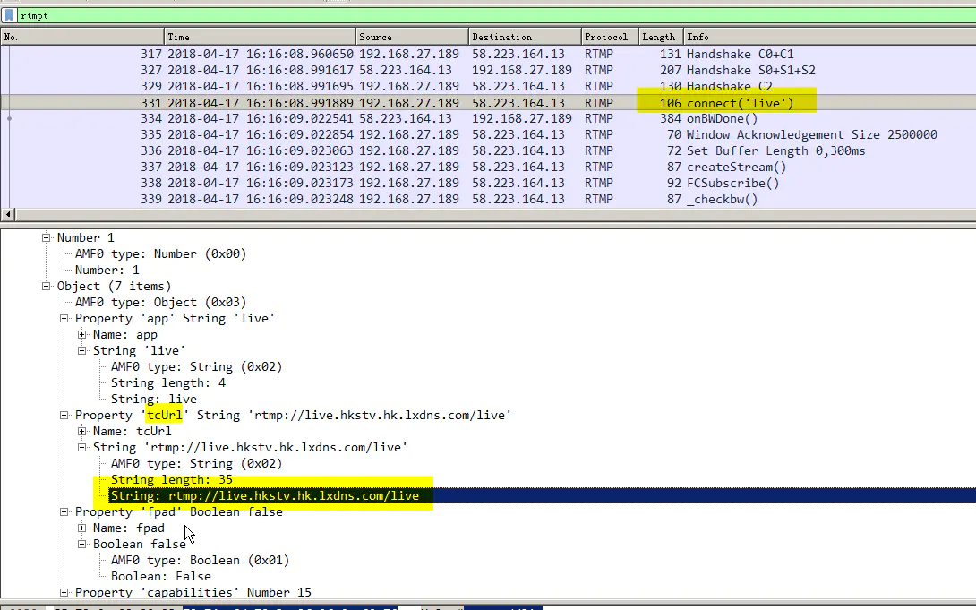 抓取rtmp地址主要通过关注connect和play两个消息。 从connect中的tcUrl获取流的域名