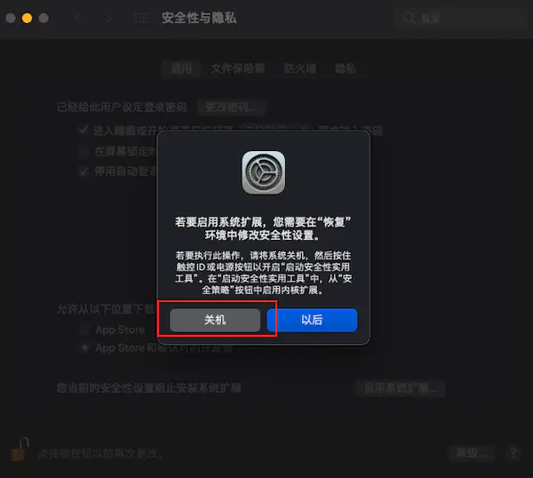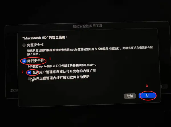 选择降低安全性,允许用户管理被认可开发者的内核扩展