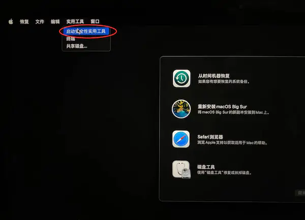 『实用工具→启动安全工具』,打开后等待出现硬盘图标